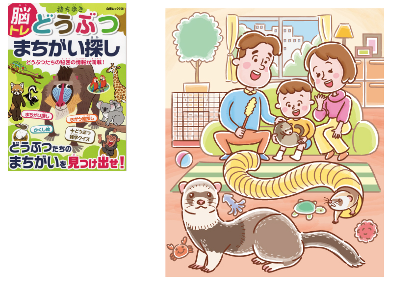 2023初冬発売の白夜書房さまの書籍「持ち歩き 脳トレ どうぶつまちがい探し」のイラストを担当させていただきました。ペットのマーシャルフェレットたちを可愛がる休日のファミリーのほのぼのした情景のイラスト描かせていただきました。