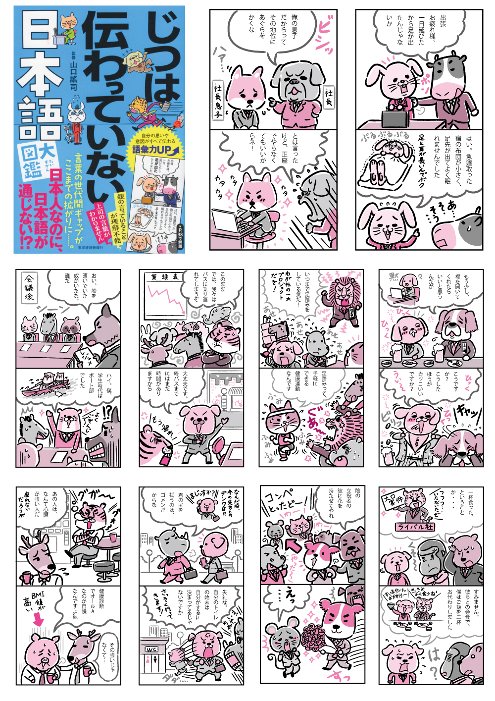 2023年末頃発売の書籍「じつは伝わっていない日本語大図鑑」のイラストを担当させていただきました。言葉の世代間ギャップや若者に理解不能な昭和世代の言い回しなどをギャグマンガにした動物のサラリーマンのイラストを描かせていただきました。