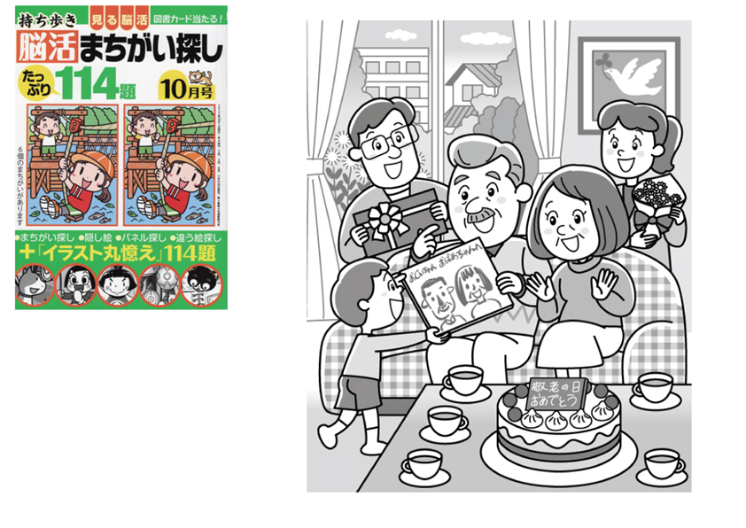 2023年秋発売の白夜書房さまの書籍「持ち歩き 脳活まちがい探し 10月号」で、イラストを担当させていただきました。敬老の日に家族からお祝いのケーキやプレゼントをもらう老夫婦の様子などの間違い探しイラストを描かせていただきました。