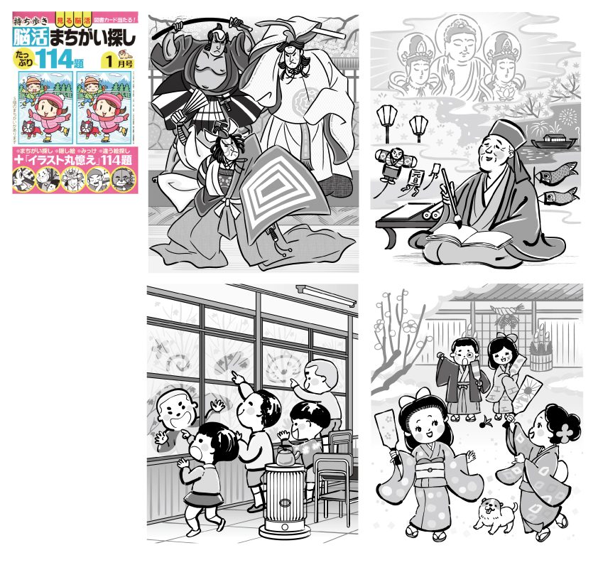 2024年初頭発売の白夜書房さまのまちがい探し本で、イラストを描かせていただきました。歌舞伎の日、小林一茶「ともかくも あなた任せの としの暮」、昭和の冬の教室、羽子板などのレトロな間違い探しのイラストを担当させていただきました。
