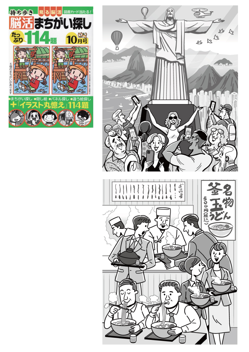 ブラジルのリオデジャネイロの観光客のイラストや、ランチタイムにうどんやそばをせわしなく食べるサラリーマンなどの間違い探しイラストを描かせていただきました。