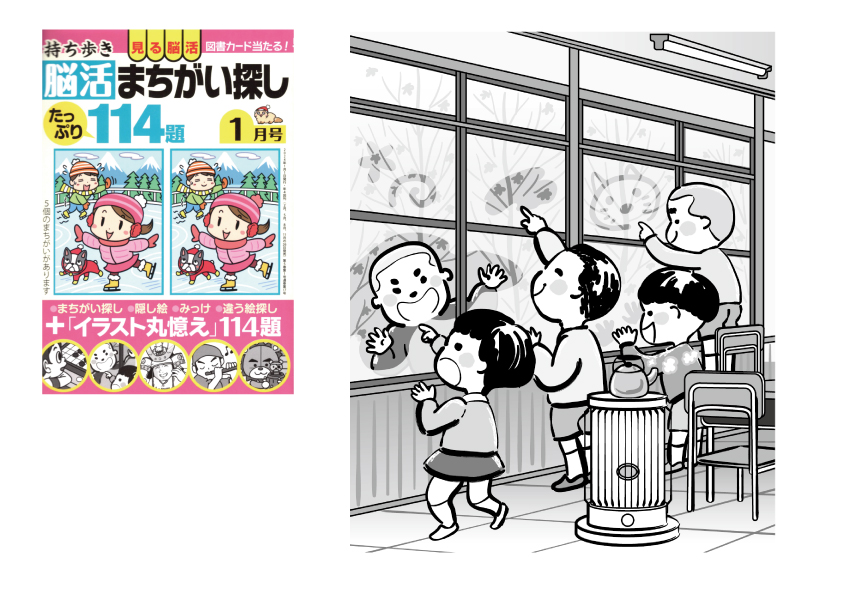 2024年初頭にイラストを担当させていただいた書籍が発売されました。昭和の冬の教室の結露した窓に落書きをする小学生たちのレトロな間違い探しイラストを描かせていただきました。